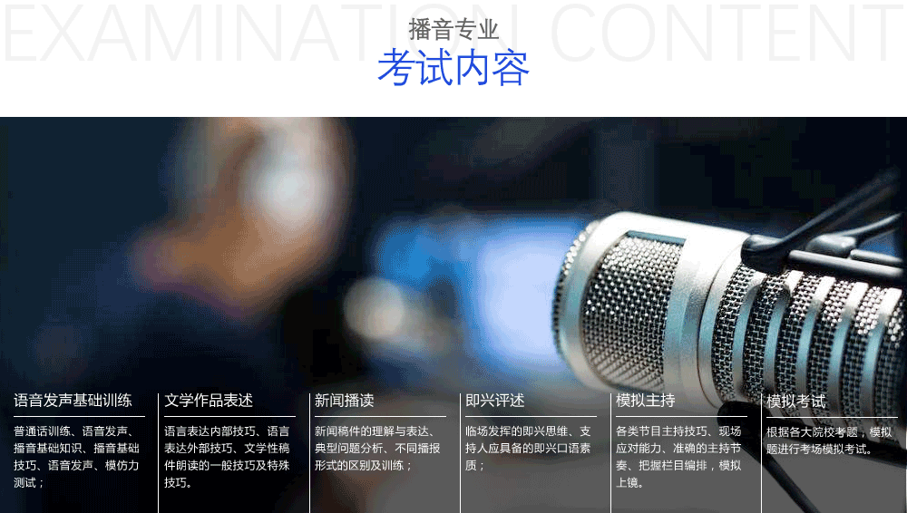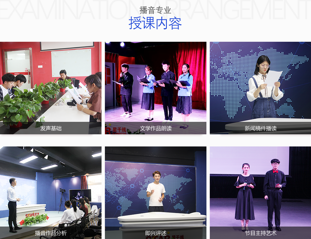 | 強化班 | 9.1-9.26 | 語音基礎與播音發聲強化訓練,即興口語表達現想現說與論點,論據,論證的運用方法,新聞稿件播音重音的運用技巧,自備稿件精講,化妝禮儀提升形象氣質。 |