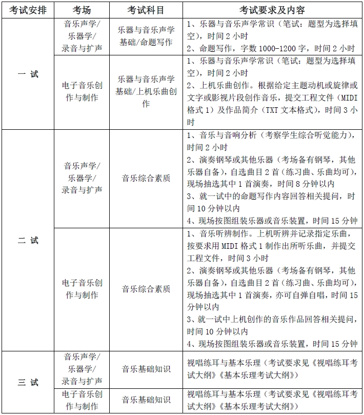 1、音樂學理論、音樂教育、音樂聲學/樂器學/錄音與擴聲、電子音樂創作與制作等招考方向:錄取分數線參照生源所在?。ㄊ?、自治區)普通本科第一批次錄取控制分數線的70%劃定。
