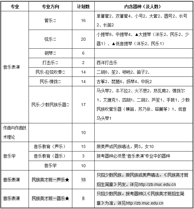 注:★我校2018年音樂表演類專業(含民族英才班)將根據生源情況制定分省招生計劃,且對兼報民族英才班的音樂表演專業考生兼報專業均進入文考名單的情況進行了限定,具體原則詳見我校2018年《藝術類招生章程》,請相關考生務必查閱了解后再行報考。