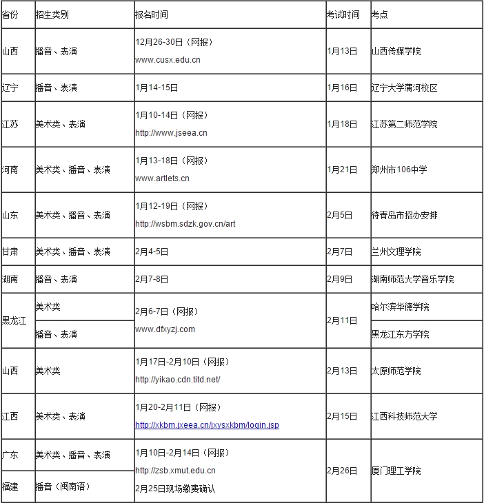 2017年我校藝術類專業考試分別在山西、遼寧、江蘇、河南、山東、甘肅、湖南、黑龍江、江西、廣東、福建等十一個省份設立“???rdquo;考點,廣東省、福建省考點設在我校,其余省份考點均安排在所在省考試院(招生辦)指定考點。