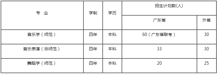 音樂學(師范)專業廣東省60名招生計劃的術科成績認可廣東省音樂術科聯考成績。其它招生計劃的術科成績只認可我校??夹g科成績,但考生必須符合所在省份的藝術類招生考試的有關要求(如該省統考,考生須參加統考并合格),文化考試按考生所在省(市、自治區)的要求參加“全國普通高校統一招生考試”,報考條件按教育部和該省的有關規定執行。考生憑該省普通高校藝術類專業考試準考證及身份證報考。