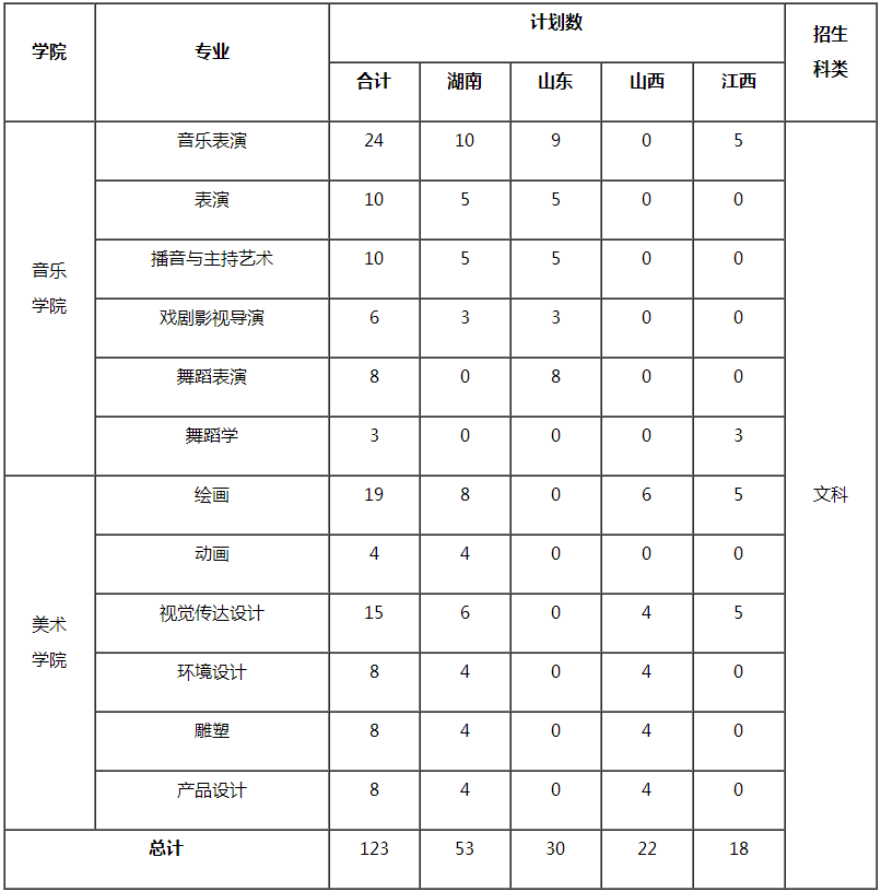 音樂學院各招生專業在湖南、山東設校考,美術學院各招生專業在湖南、山西設???,江西省不設校考,認可當地省統考成績。校考科目及要求如下:
