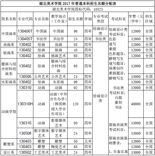 省外考點截止時間:見《湖北美術學院2017年普通本科招生專業考試考點設置及報名考試時間安排》(江蘇籍、湖南籍考生在生源地所在省份教育考試院統一藝術類校考報名網站報名)。