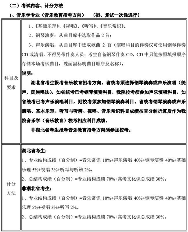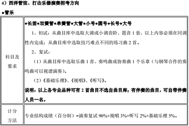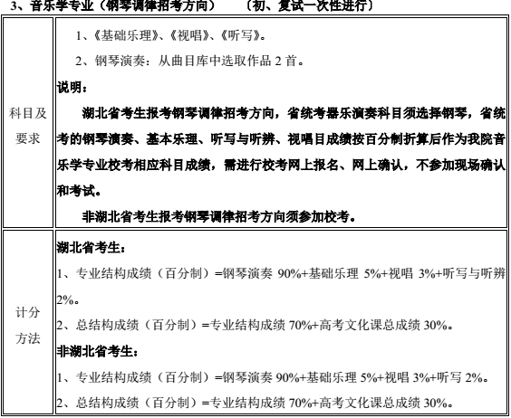 3、曲目庫和筆試科目考試大綱詳見我院招生信息網(http://zsks.whcm.edu.cn);音樂教育、鋼琴調律、鋼琴演奏、鋼琴演奏與編導、演唱、通俗聲樂演唱與編導、二胡、古箏、小提琴、薩克斯管、指揮招考方向(品種)必須嚴格按照招生簡章要求從曲目庫中選取曲目參加考試,其它音樂表演類各招考方向(品種)可有 2首曲目不選自曲目庫。