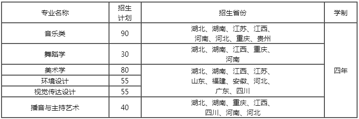我校藝術專業現設有音樂類、舞蹈學、美術學、環境設計、視覺傳達設計、播音主持與藝術等6個本科專業(類),10多個專業方向,學?,F有中國語言文學一級學科下的藝術文化學二級學科碩士點和教育學一級學科下的課程與教學論(音樂、美術、書法)方向碩士點,藝術碩士專業學位點已通過湖北省政府學位委員會全體會議審議。學校擁有一流的藝術教學科研設施,并建立了26個校外實習實踐基地。