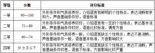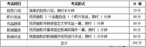 考察考生是否具備學習播音與主持專業的基本語音條件及語言表達基礎。要求普通話標準、口齒清晰、聲音圓潤、表達流暢、有感染力。