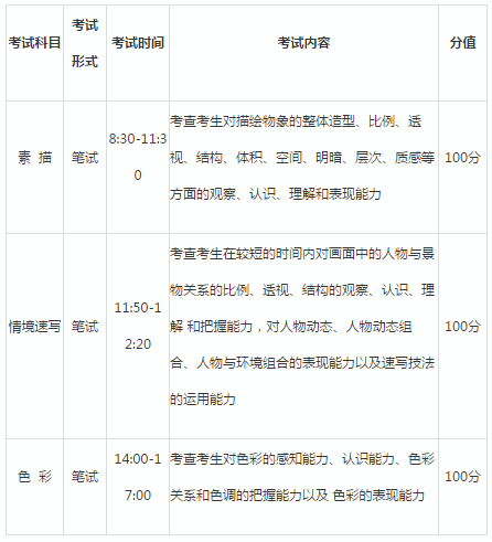 考試共設3個科目,分別考察考生的造型能力及色彩表現能力、形象記憶及閱讀與想象力。專業成績滿分為300分??荚嚳颇烤唧w分值如下: