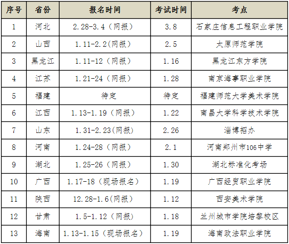 1、2018年我校在河北、山西、黑龍江、江蘇、福建、江西、山東、河南、湖北、廣西、陜西、甘肅、海南等13個省份組織藝術專業??肌?br />