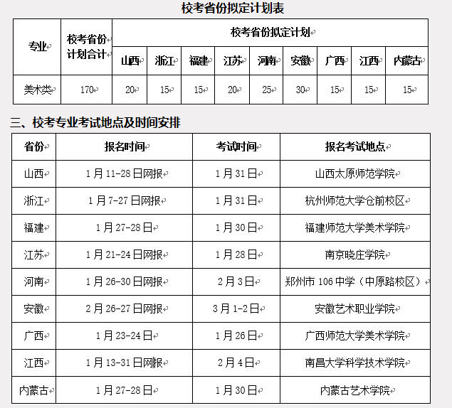 我校2018年美術類專業擬在湖南、山西、浙江、福建、江蘇、河南、安徽、廣西、江西、內蒙古等省份招生。校考省份擬定計劃見下表,湖南等承認省統考成績省份招生計劃另行公布,具體招生計劃詳見各?。▍^、市)2018年招生計劃來源表。