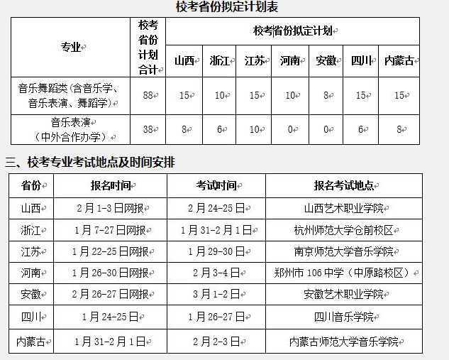 3. 其他承認省統考成績省份報考我校音樂類、舞蹈類專業的考生須參加生源所在省份音樂類、舞蹈類專業統考,我校認可其省統考成績并使用省統考成績作為專業成績。考生須省統考合格,且高考文化成績、統考專業成績均達到生源?。▍^、市)招生考試機構劃定的相應批次藝術本科專業錄取控制分數線,我校按統考專業成績從高到低錄取。專業成績相同時,文化成績高者優先。