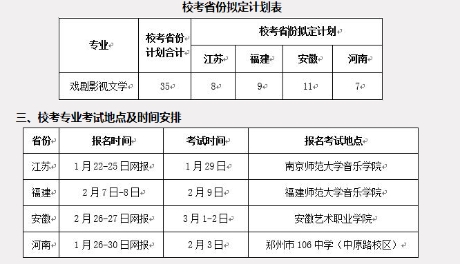我校2018年戲劇影視文學專業擬在湖南、江蘇、福建、安徽、河南等省份招生。??际》輸M定計劃見下表,湖南等承認省統考成績省份招生計劃另行公布,具體招生計劃詳見各省(區、市)2018年招生計劃來源表。