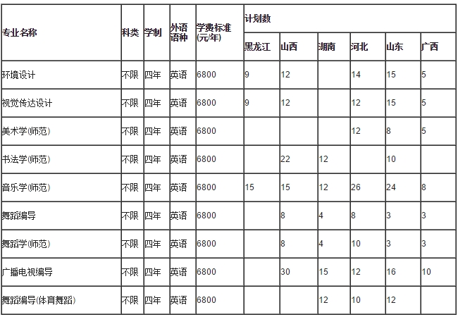| 書法學(師范) | 不限 | 四年 | 英語 | 6800 | 12 |