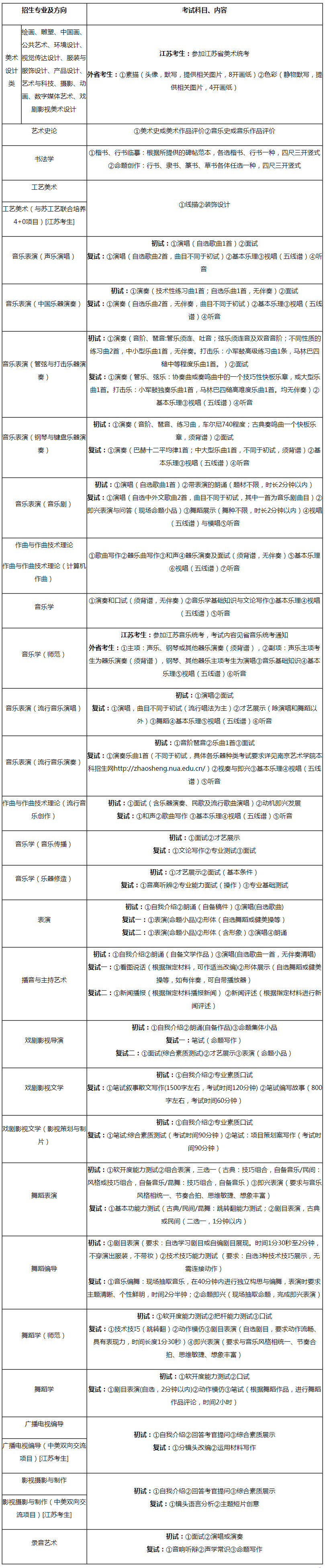 報考其他學院的音樂學(師范)、繪畫、中國畫、雕塑、公共藝術、環境設計、視覺傳達設計、服裝與服飾設計、產品設計、藝術與科技、戲劇影視美術設計、攝影、動畫、數字媒體藝術(含中英合作辦學)專業的江蘇省考生,只需參加江蘇省音樂或美術專業統考。