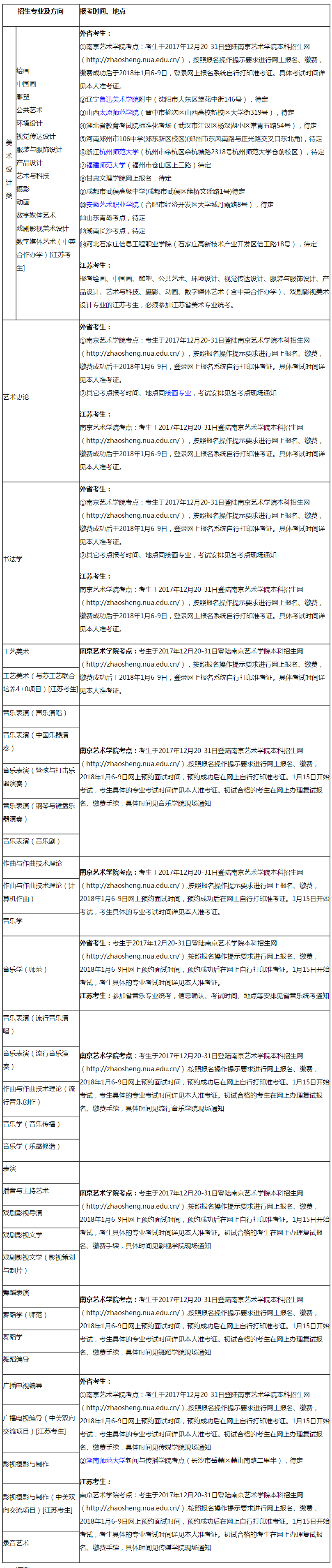 ①我校除南藝校內考點外,部分專業在外省設有專業考點,各考點進行考試的專業不同,外省考生請根據擬報考的專業以及各考點的相關規定,選擇相應考點參加專業考試。凡考生高考所在省設有考點,考生只能在本省考點參加專業考試。