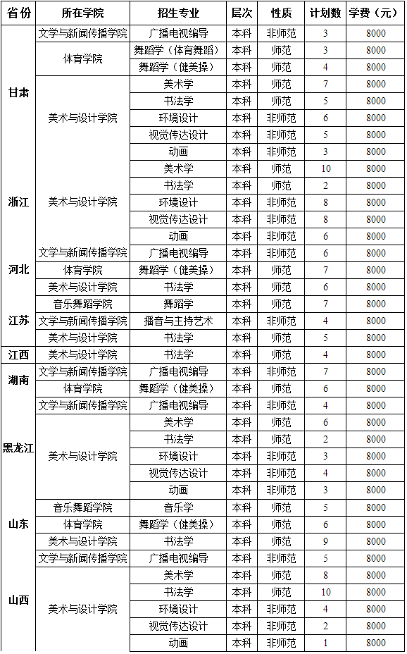 上饒師范學院2018年藝術校考省份、專業、計劃一覽表