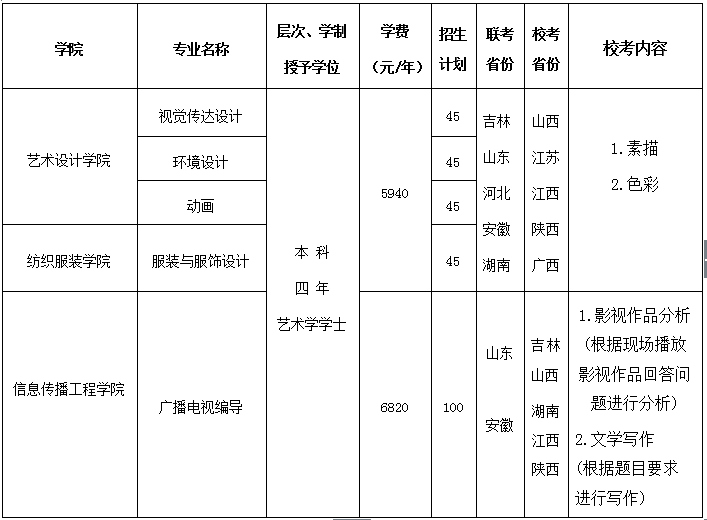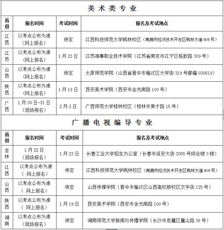 1.考生按所在省份考點的要求報名、繳費,美術類專業(含服裝與服飾設計、視覺傳達設計、環境設計和動畫)考試內容相同,成績通用,錄取時以高考志愿為準。