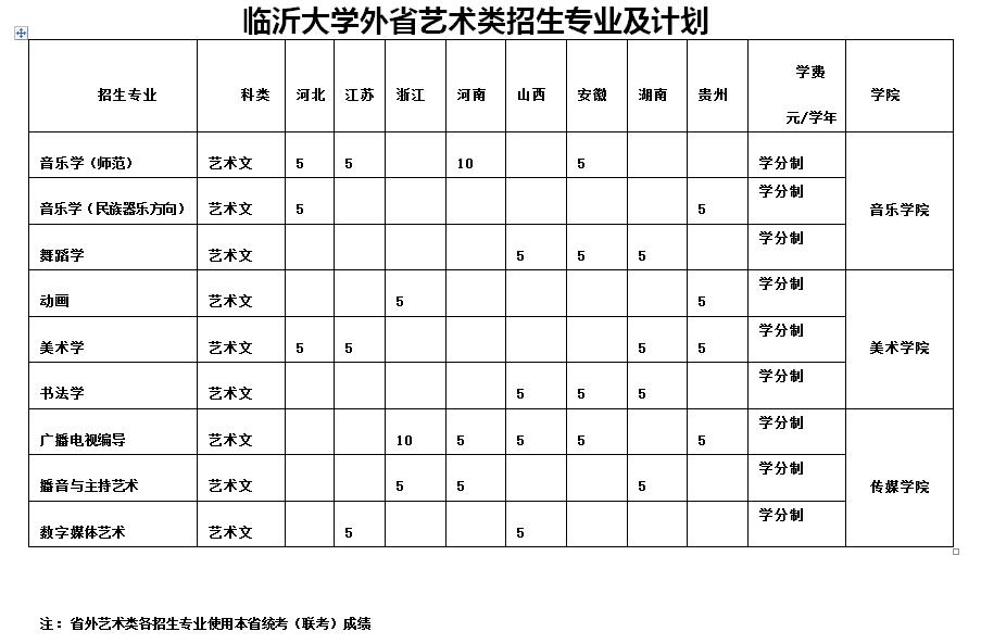 2017年,臨沂大學藝術類本科招生專業或方向共16個,擬招生895人。其中,省內投放計劃745人,省外投放計劃150人。美術類專業投放計劃380人,非美術類專業投放計劃515人。