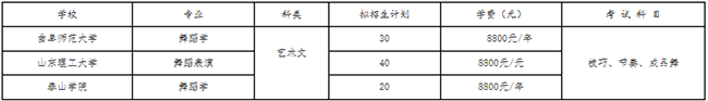 2、舞蹈類專業(山東省內生源,不含服裝表演方向)參加曲阜師范大學、山東理工大學和泰山學院三校聯考,音樂類、舞蹈類專業(山東省內生源,服裝表演方向,女生)專業考試由我校單獨組織???。