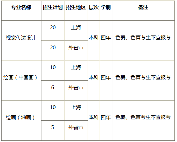 備注:2017年錄取規則為:藝術類專業錄取時采用各省(區、市)專業考試和文化考試統一考試成績,我校不再加試。上海考生投檔后按綜合成績【綜合成績=高考文化考試成績+專業考試成績×(高考總分/專業總分)】分數優先,遵循志愿的原則錄取專業,同分條件下,優先錄取專業考試成績優秀的考生。如果省(區、市)高招辦另有特殊政策的,遵照省級高招辦政策執行。