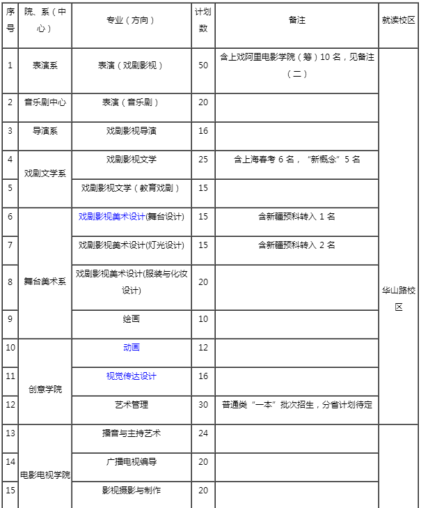 (四)除預科轉入、春季考試及“一本”批次招生專業以外,不作分省市計劃的專業(方向)全國統招, 藝術類文理兼收;表演(戲劇影視、音樂劇)專業在擬招生地區范圍內,藝術類文理兼收。