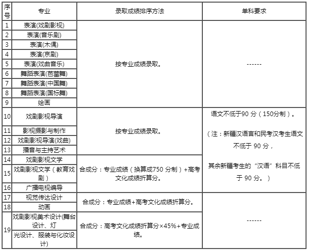 根據教育部關于普通高等藝術院校招生的相關規定,我??筛鶕鲗I(方向)合格人數,參照招生計劃數,確定高考錄取控制分數線,具體辦法按照教育部教學廳[2017]15 號文件執行。凡我校專業考試合格,在我校高考錄取控制分數線以上的考生分別按以下辦法從高分到低分擇優錄取: