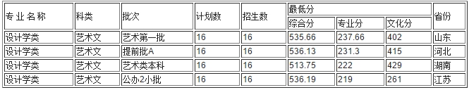 序號 專業名稱 科類 批次 招生計劃 擬錄取數 最低分 綜合分 專業分 文化分 1 播音與主持藝術 藝文 藝1 15 15 510.6 79.6 447 2 設計學類 藝文 藝1 136 136 563.75 81 426 3 設計學類 藝理 藝1 10 10 572.75 84 448