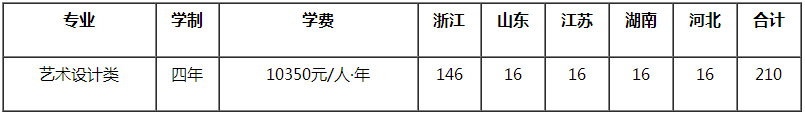 專業名稱:藝術設計類;招生計劃210名;藝術類分文理科的省份僅面向藝術類文科考生招生,不分文理科的省份不作文理科報考要求,分省計劃如下: