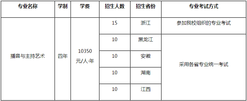 (一)在黑龍江、安徽、湖南、江西等省按當地招生主管部門規定的專業統一考試報名辦法、報名時間、專業考試科目等執行,我校不組織專業???。專業成績均采用各省播音與主持藝術專業統考成績。